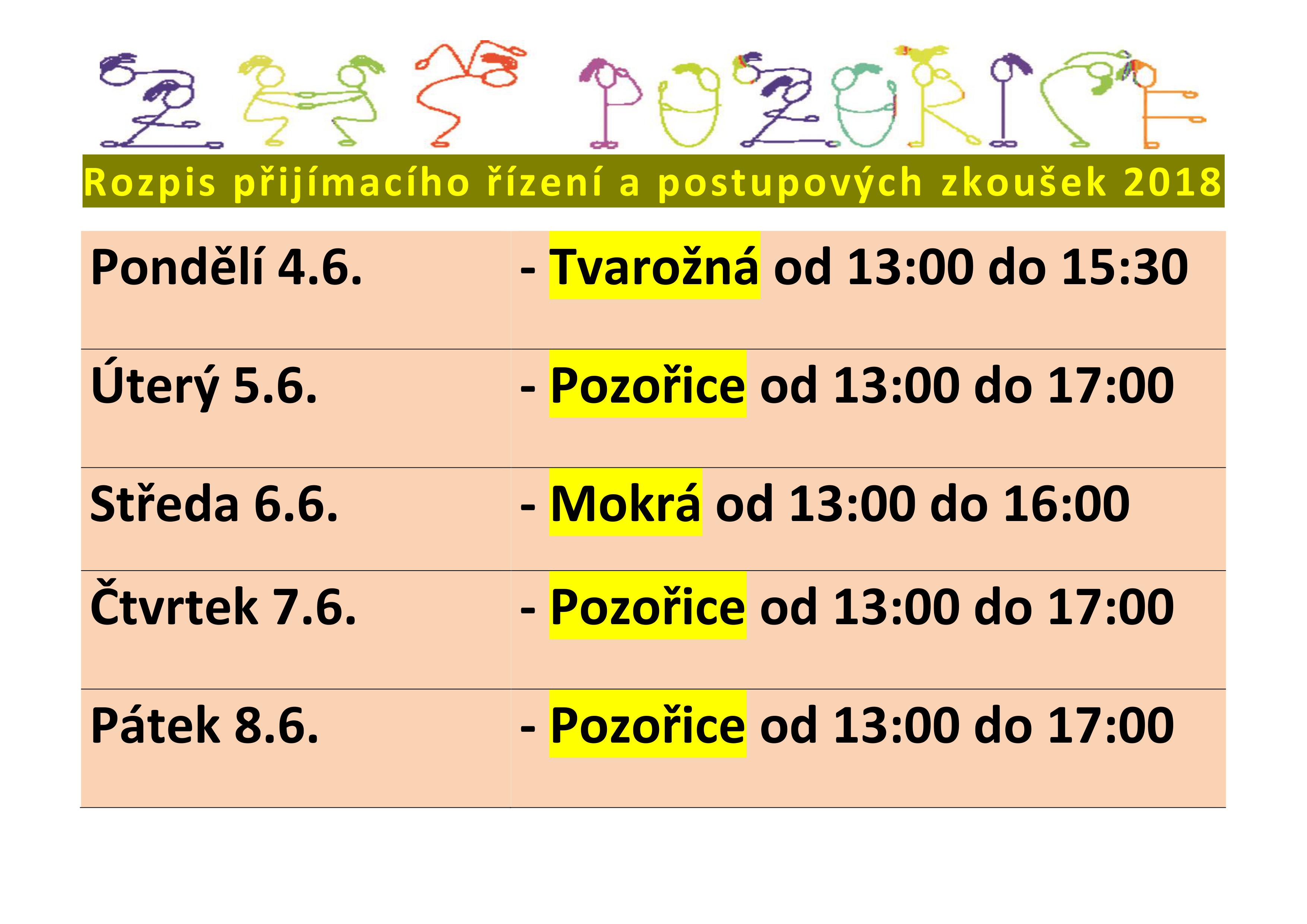 Rozpis přijímacího řízení a postupových zkoušek 2018