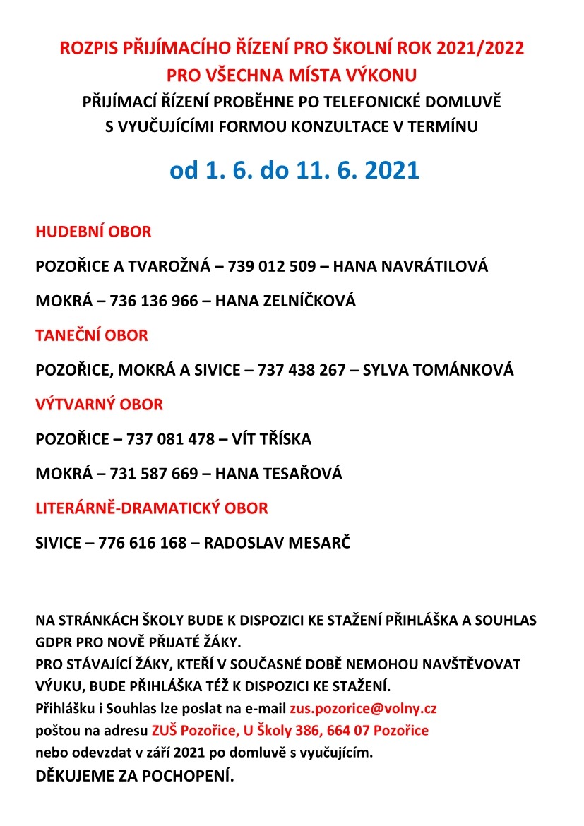 ROZPIS PŘIJÍMACÍHO ŘÍZENÍ PRO ŠKOLNÍ ROK 2021/2022